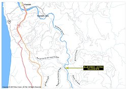 Map of the lower reach of the Klamath River as it flows through approximately 14 miles of Yurok Territory on its way to the Pacific Ocean. Click on thumbnail for a larger image and to download a high resolution version of the map in Acrobat PDF format.